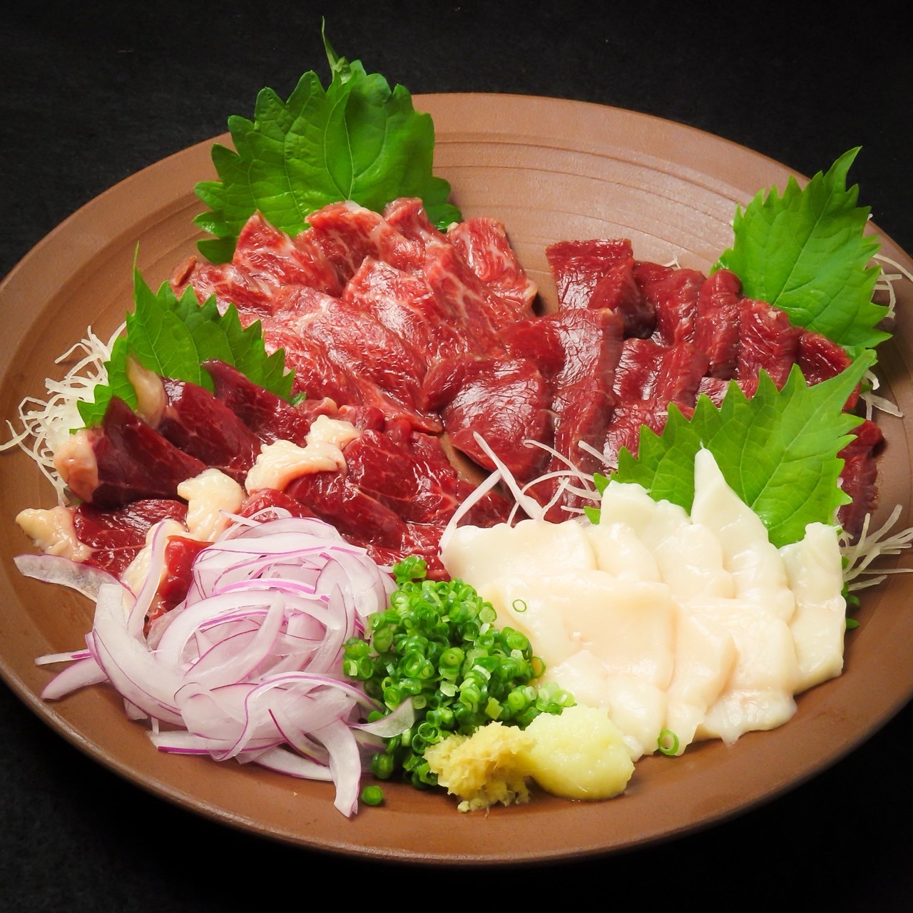 新鮮な国産馬刺しの様々な部位を食べ比べできる、特別な盛り合わせです。馬肉が持つそれぞれの部位の食感や味わいの違いをお楽しみいただけます。